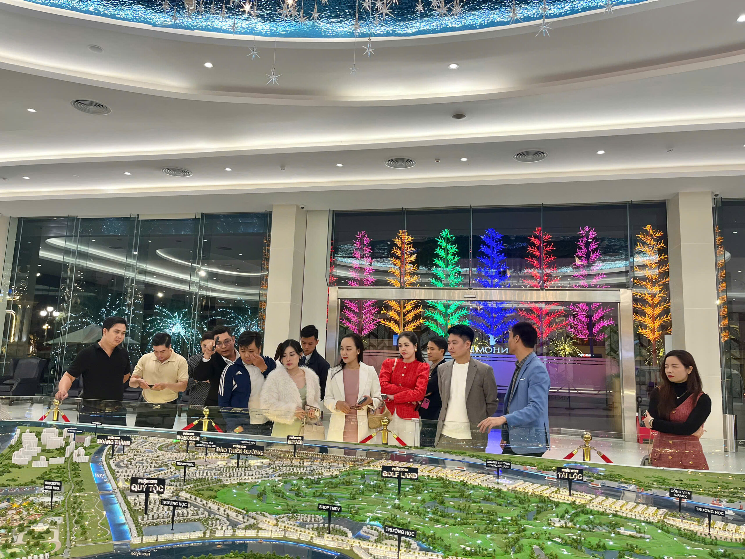 Một trong những điểm nhấn quan trọng của chuyến công tác là buổi tham quan sa bàn đại dự án Vinhomes Royal Island. Không gian triển lãm hiện đại, hệ thống ánh sáng sống động cùng mô hình quy hoạch chi tiết đã giúp đội ngũ miền Nam hình dung rõ ràng hơn về: